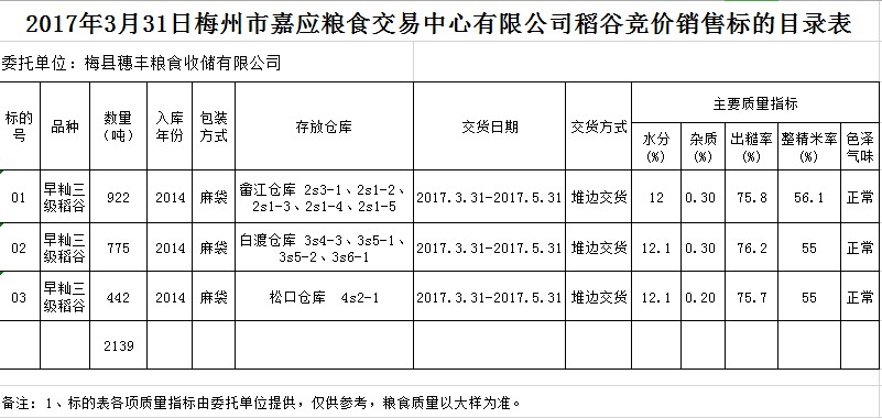 受客戶委托,梅州市嘉應(yīng)糧食交易中心有限公司定于2017331日舉辦糧食競(jìng)價(jià)交易會(huì),梅州市梅縣區(qū)穗豐糧食收儲(chǔ)有限公司擬銷售早秈三級(jí)稻谷2139噸。