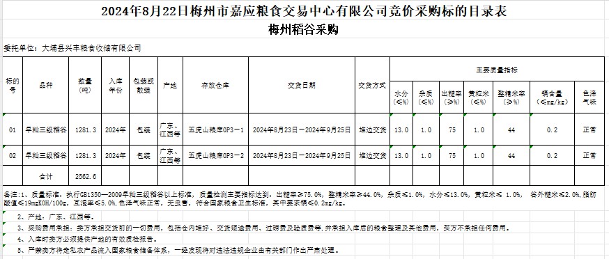 受客戶委托,梅州市嘉應糧食交易中心有限公司定于2024年8月22日(星期四)舉辦糧食競價交易會。大埔縣興豐糧食收儲有限公司擬采購2024年產(chǎn)早秈稻谷2562.6噸。