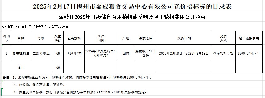 蕉嶺縣2025年縣級(jí)儲(chǔ)備食用植物油采購(gòu)及包干輪換費(fèi)用公開招標(biāo)公告