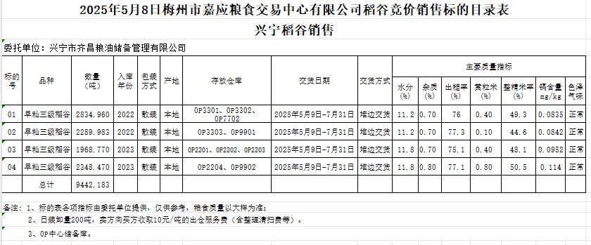 受客戶(hù)委托,梅州市嘉應(yīng)糧食交易中心有限公司定于2025年5月8日(星期四)舉辦糧食競(jìng)價(jià)交易會(huì)。興寧市齊昌糧油儲(chǔ)備管理有限公司擬銷(xiāo)售2022年、2023年產(chǎn)早秈稻谷9442.183噸。