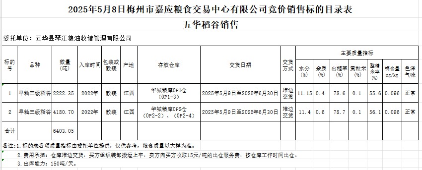 受客戶委托,梅州市嘉應(yīng)糧食交易中心有限公司定于2025年5月8日(星期四)舉辦糧食競價(jià)交易會(huì)。五華縣琴江糧油收儲(chǔ)管理有限公司擬銷售2022年產(chǎn)早秈稻谷6403.05噸。