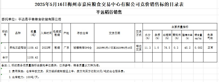 受客戶委托,梅州市嘉應(yīng)糧食交易中心有限公司定于2025年5月16日(星期五)舉辦糧食競(jìng)價(jià)交易會(huì)。平遠(yuǎn)縣平糧糧食收儲(chǔ)有限公司擬銷(xiāo)售2022年產(chǎn)早秈稻谷1109.43噸。