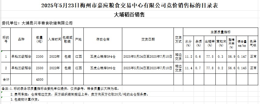 受客戶委托,梅州市嘉應(yīng)糧食交易中心有限公司定于2025年5月23日(星期五)舉辦糧食競價(jià)交易會(huì)。大埔縣興豐糧食收儲(chǔ)有限公司擬銷售2022年產(chǎn)早秈稻谷4800噸。