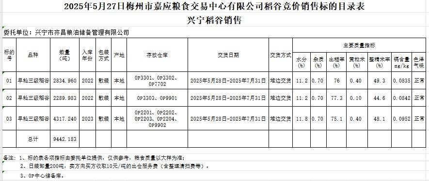 受客戶委托,梅州市嘉應(yīng)糧食交易中心有限公司定于2025年5月27日(星期二)舉辦糧食競(jìng)價(jià)交易會(huì)。興寧市齊昌糧油儲(chǔ)備管理有限公司擬銷售2022年、2023年產(chǎn)早秈稻谷9442.183噸。