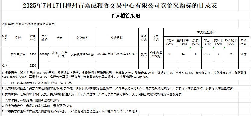 受客戶委托,梅州市嘉應(yīng)糧食交易中心有限公司定于2025年7月17日(星期四)舉辦糧食競價(jià)交易會。平遠(yuǎn)縣平糧糧食收儲有限公司擬采購2025年產(chǎn)早秈稻谷2200噸。