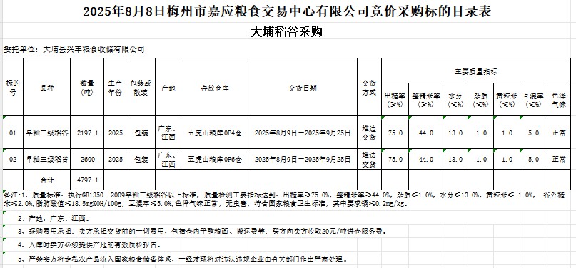 受客戶委托,梅州市嘉應糧食交易中心有限公司定于2025年8月8日(星期五)舉辦糧食競價交易會。大埔縣興豐糧食收儲有限公司擬采購2025年產早秈稻谷4797.1噸。