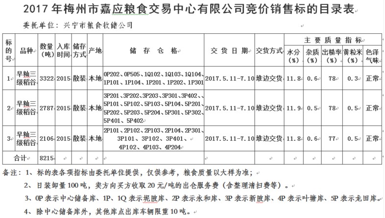 受客戶委托,梅州市嘉應糧食交易中心有限公司定于2017年5月10日舉辦糧食競價交易會,興寧市糧食收儲公司擬銷售2015年早秈三級稻谷8215噸。(僅限現(xiàn)場交易)
