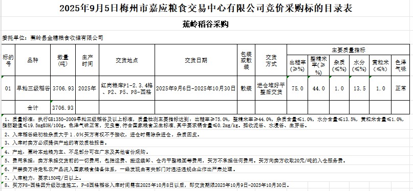 受客戶委托,梅州市嘉應(yīng)糧食交易中心有限公司定于2025年9月5日(星期五)舉辦糧食競價(jià)交易會。蕉嶺縣金穗糧食收儲有限公司采購2025年產(chǎn)早秈稻谷3706.93噸。