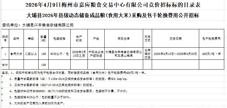 文件下載:2026年4月9日大埔縣2026年縣級動態(tài)儲備成品糧(食用大米)采購及包干輪換費用公開招標公告