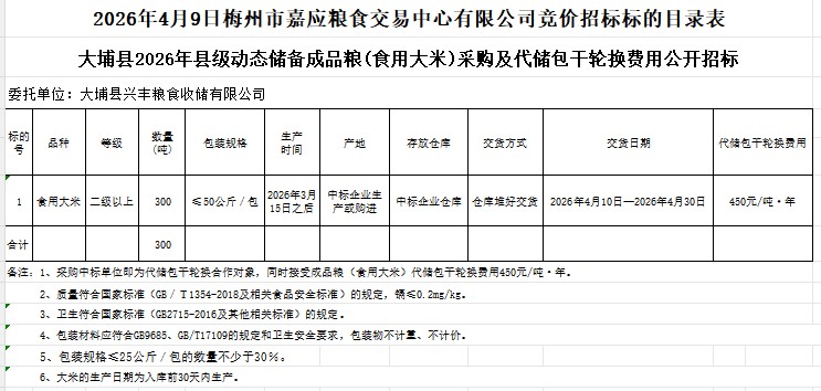 文件下載:2026年4月9日大埔縣2026年縣級動態(tài)儲備成品糧(食用大米)采購及代儲包干輪換費(fèi)用公開招標(biāo)公告