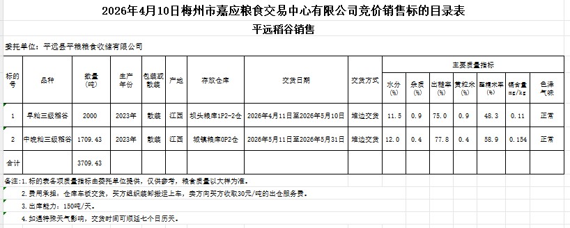 受客戶委托,梅州市嘉應(yīng)糧食交易中心有限公司定于2026年4月10日(星期五)舉辦糧食競(jìng)價(jià)交易會(huì)。平遠(yuǎn)縣平糧糧食收儲(chǔ)有限公司擬銷售2023年產(chǎn)早秈稻谷、中晚秈稻谷3709.43噸。