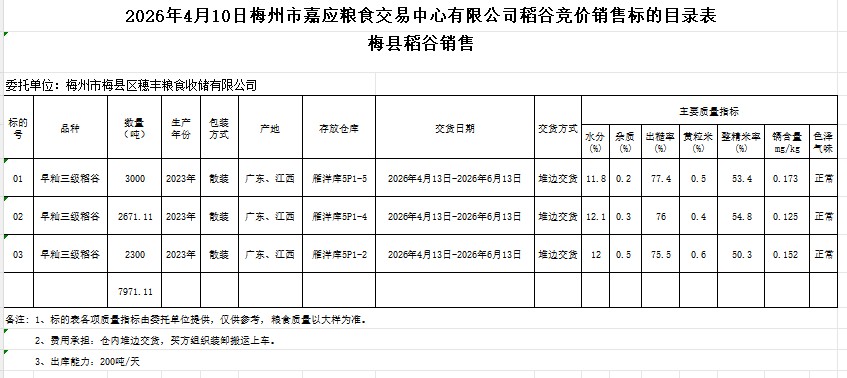 文件下載:2026年4月10日梅州市梅縣區(qū)穗豐糧食收儲(chǔ)有限公司稻谷銷售