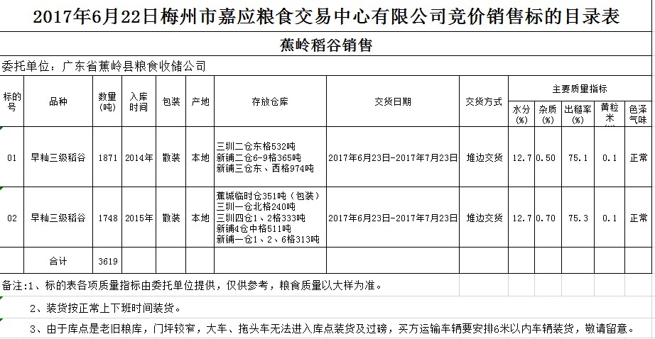 受客戶委托,梅州市嘉應糧食交易中心有限公司定于2017年6月22日舉辦糧食競價交易會,廣東省蕉嶺縣糧食收儲公司擬銷售2014、2015年早秈三級稻谷共3619噸。