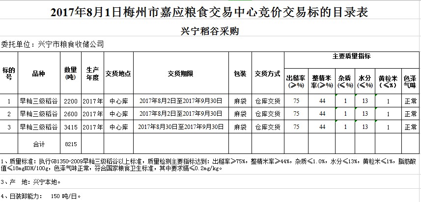 受客戶委托,梅州市嘉應(yīng)糧食交易中心有限公司定于2017年8月1日舉辦糧食競(jìng)價(jià)交易會(huì),興寧市糧食收儲(chǔ)公司擬采購2017年早秈三級(jí)稻谷共8215噸。