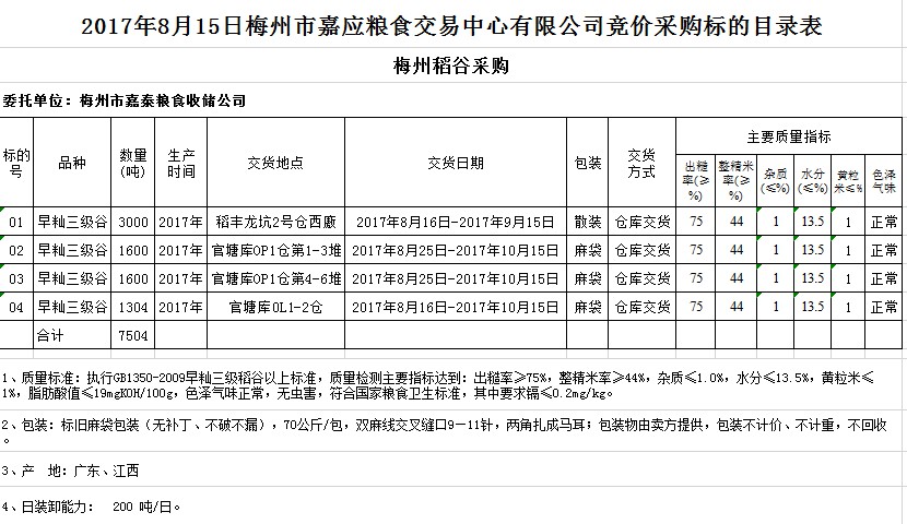 受客戶委托,梅州市嘉應(yīng)糧食交易中心有限公司定于2017年8月15日舉辦糧食競價(jià)交易會(huì),梅州市嘉泰糧食收儲(chǔ)公司擬采購2017年早秈三級稻谷共7504噸。