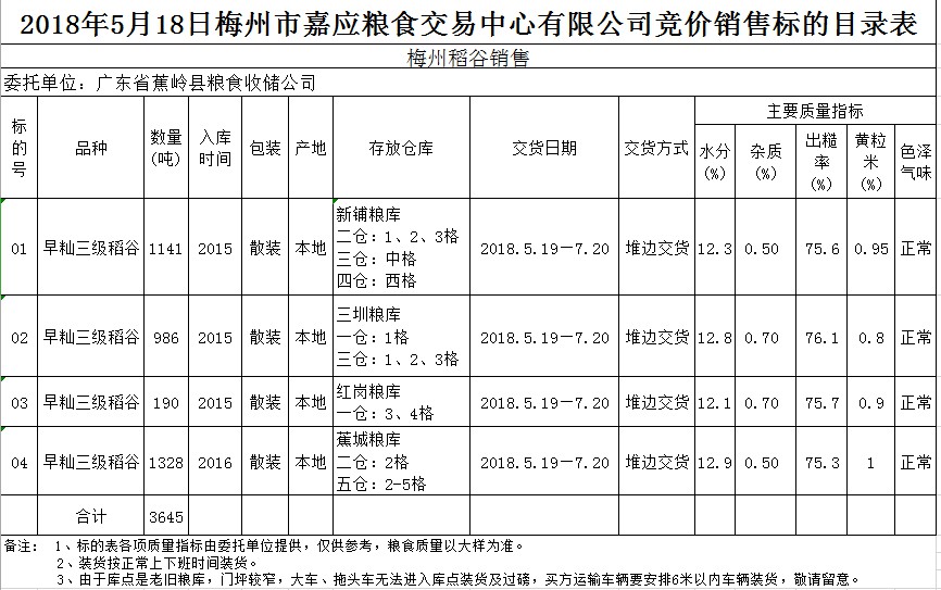 受客戶委托,梅州市嘉應糧食交易中心有限公司定于2018年5月18日(星期五)舉辦糧食競價交易會,廣東省蕉嶺縣糧食收儲公司擬銷售早秈稻3645噸。