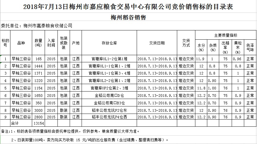 受客戶委托,梅州市嘉應(yīng)糧食交易中心有限公司定于2018年7月13日(星期五)舉辦糧食競(jìng)價(jià)交易會(huì),梅州市嘉泰糧食收儲(chǔ)公司擬銷(xiāo)售早秈稻13154噸。