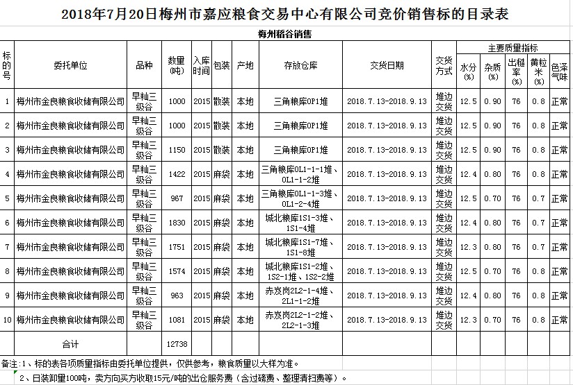 交易時間和地點:2018年7月20日(星期五)上午10時15分。廣東省梅州市彬芳大道南161號梅州市糧食交易中心3樓。